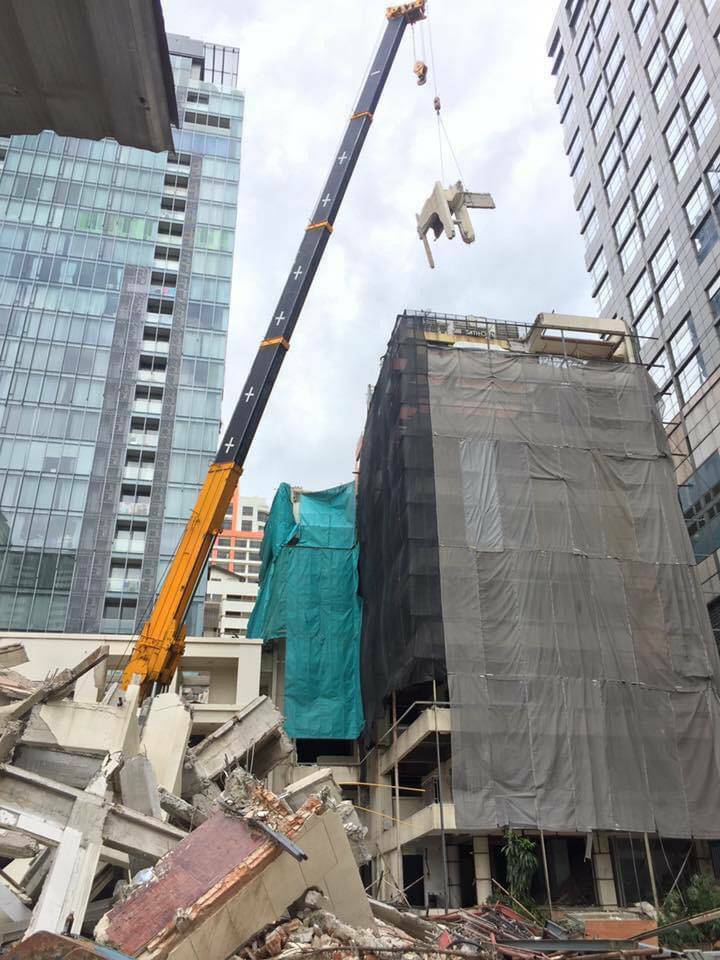 - จนกระทั่งพิจารณาแล้วว่าโครงสร้างอยู่ในเกณฑ์ที่ปลอดภัย จึงเริ่มรื้อถอนคานและเสาที่เหลือสลับกับการขนย้ายเศษขยะ ออกนอกพื้นที่จนกระทั่งถึงขั้นตอนการขุดรื้อฐานรากออก และปรับพื้นที่ให้เรียบร้อย