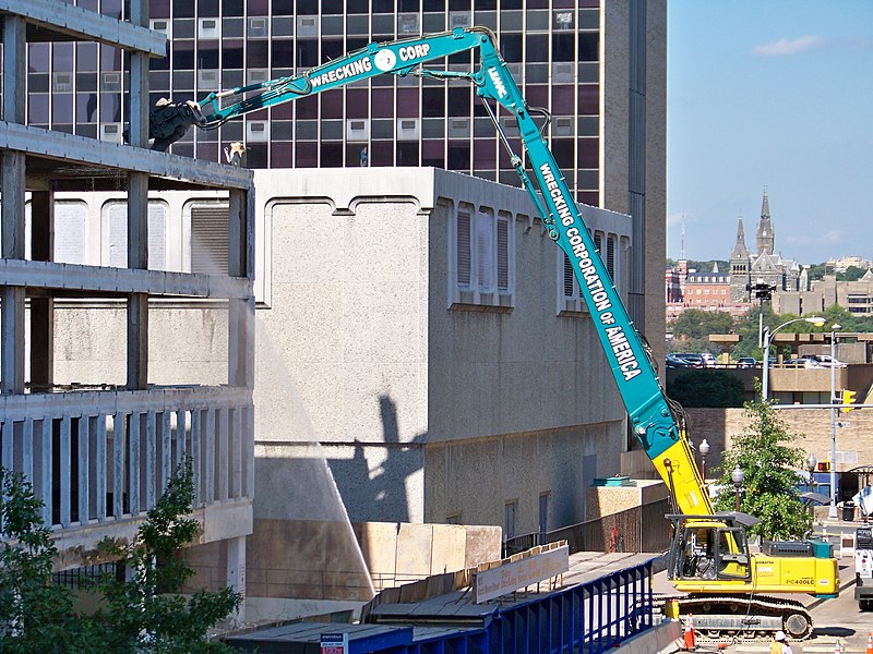 รถขุดเจาะระยะไกลที่ใช้ในการรื้อถอนอาคารสำนักงานใน Rosslyn , Virginia