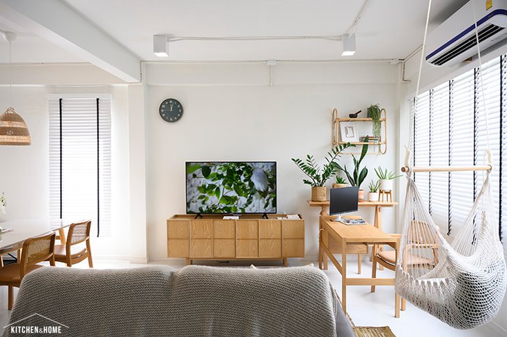 เมื่อเปิดประตูบานเฟี้ยมออกก็สามารถนอนดูทีวีได้จากในห้องนอน หรือจะขยับออกมานั่งเล่น นอนเล่นตรงโซฟาก็ได้ ซึ่งโซนนี้ยังแบ่งเป็นมุมสำหรับทำงาน ตกแต่งด้วยต้นไม้นิดหน่อย เพิ่มความสดชื่นให้กับห้อง